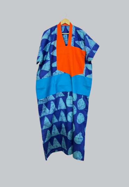 Make a statement with this eye-catching batik kaftan. The stunning blue pattern is enhanced by contrasting orange and turquoise panels, creating a bold and modern look. Crafted with high-quality fabric, this kaftan is both comfortable and stylish. Perfect for special occasions or everyday wear, this piece is a must-have for anyone who appreciates unique and vibrant fashion.